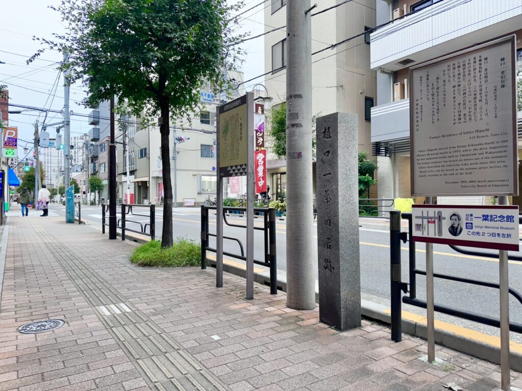 Additionally, there is a monument to the former residence of Higuchi Ichiyo on Chayamachi Street, about a two-minute walk from the Ichiyo Memorial Museum. The Ryusen area has changed significantly since Ichiyo lived there due to land readjustment projects as part of the Imperial Capital Reconstruction Plan following the Great Kanto Earthquake, but traces of the “single straight road from Shitaya to Yoshihara” still remain.