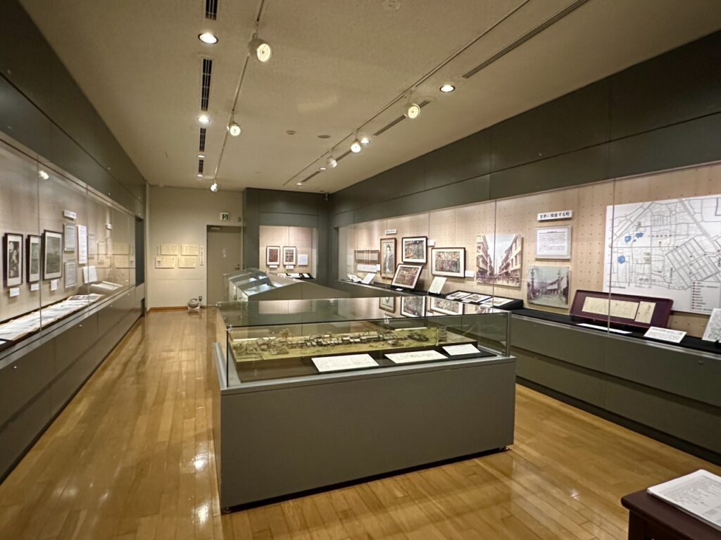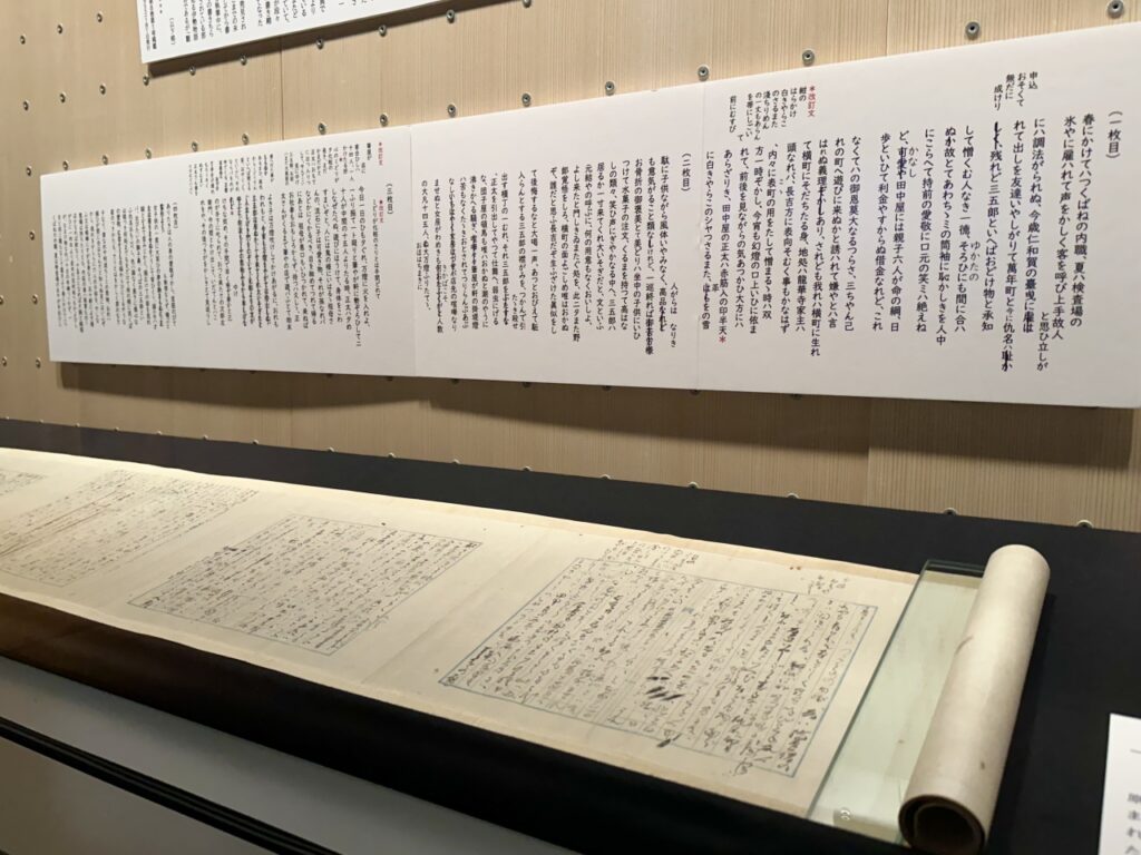 Upon entering the exhibition room, visitors are greeted by a model of Shitaya Ryusenjicho as it was at the time , recreated based on meticulous historical research and interviews. In the center are the two tenement houses where Ichiyo lived, and at the end of Daionji Street (now Chayamachi Street), which stretches straight out from there, you can see the stone wall and emergency gate of Ohaguro-dobu, which marks the boundary with the Yoshiwara red-light district. It is only a few minutes’ walk away.