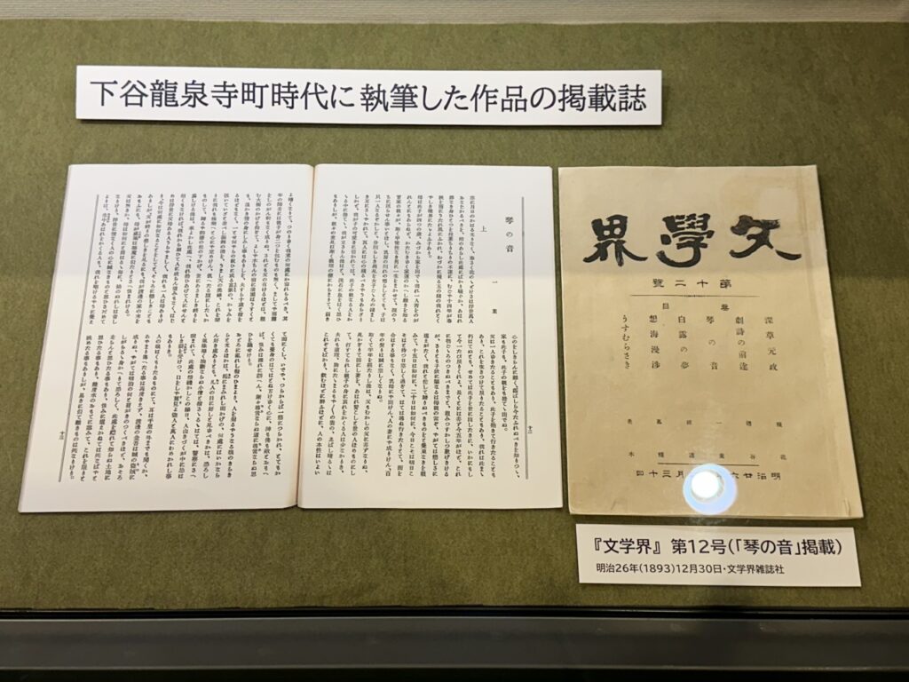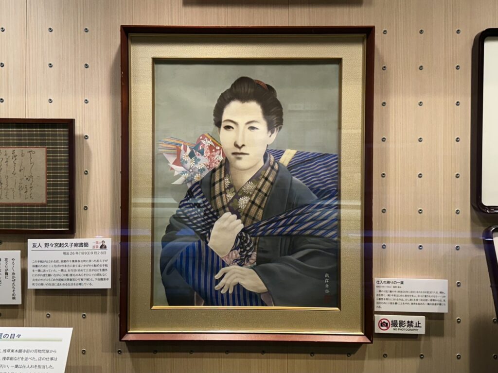 In the end, his business did not get on track, and he ended up moving to Fukuyama-cho, Maruyama, Hongo after just over nine months. From there, he devoted himself to writing, publishing a succession of masterpieces, including “Takekurabe,” “Nigorie,” and “Juusanya,” based on his experiences living in Shitaya Ryusenji-cho. These were later described as “14 miraculous months.” He was highly praised by Mori Ogai and Koda Rohan, and received numerous requests to write, but he died of pulmonary tuberculosis in 1896, at the young age of 24.