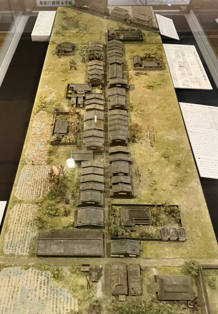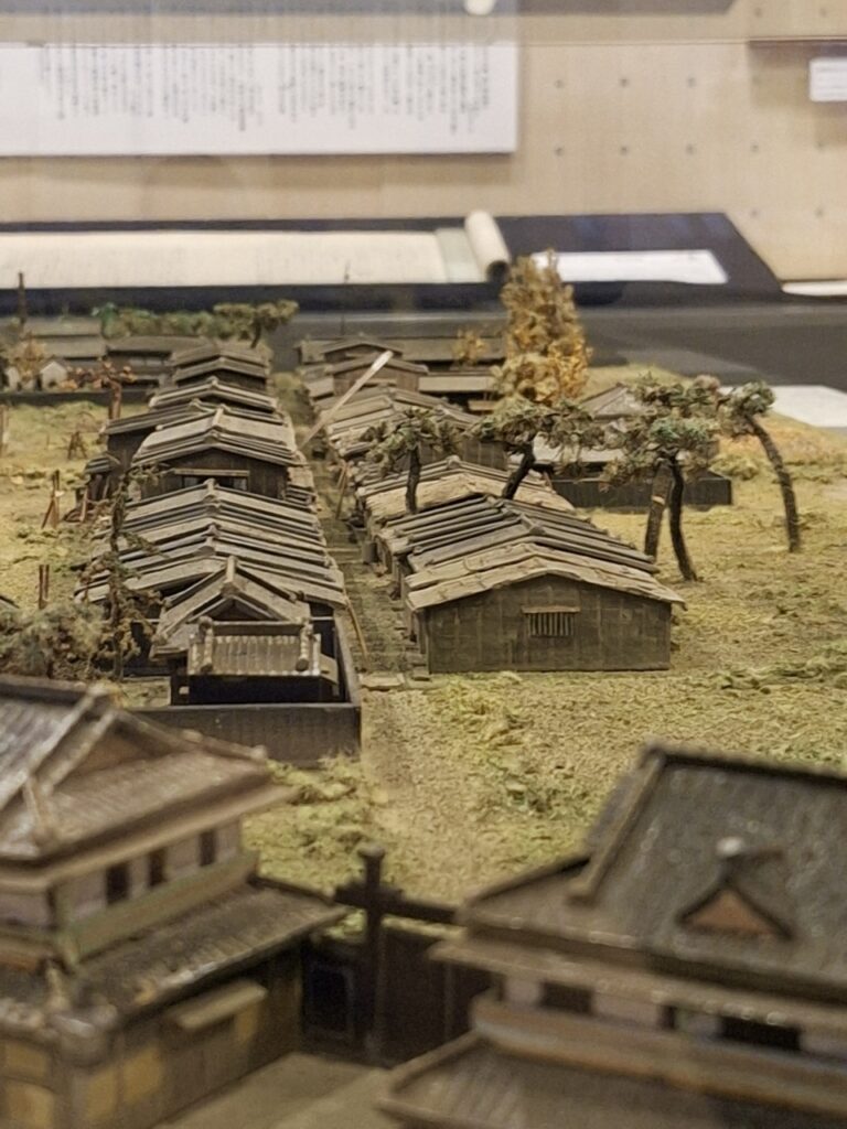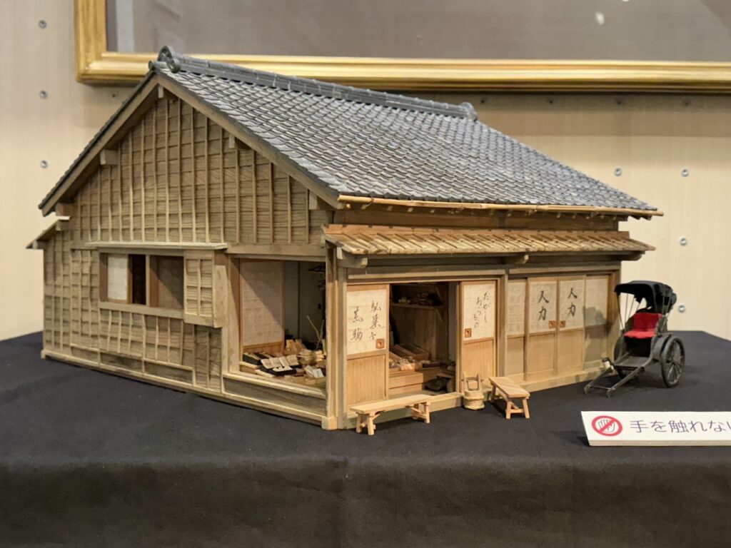 Daionji Street, which connects Mishima Shrine to the Yoshiwara pleasure district, was a major route taken by rickshaws bound for Yoshiwara. When you look at the model together with Ichiyo’s words, the stark contrast between Yoshiwara’s vibrant lights, the bustling three-story brothels, and the constant traffic, and the shabby tenement district nearby, becomes clear.