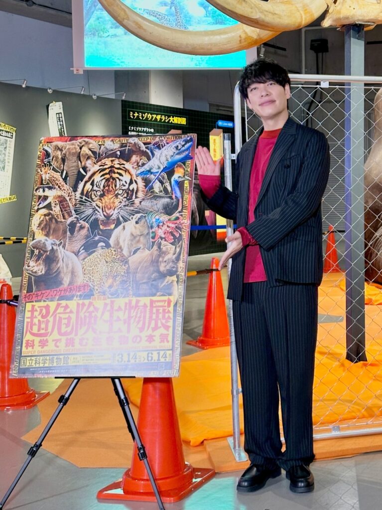 Regarding his impressions of the exhibition, he commented, “There are many globally valuable materials, and the exhibition unfolds in a laboratory-like world in each area, so it felt like an attraction. As I went further in, I became more immersed, and I felt like I was part of the research team.” He said that the most noteworthy dangerous animal was the giraffe, and he said, “They are herbivores, and judging from their eyes, I thought they were gentle and cute, but when I saw the video, I learned that they can fight with necking, which is powerful enough to kill a person with their own neck. I felt bad for casually saying, ‘It’s a giraffe’,” which drew laughter from the audience.