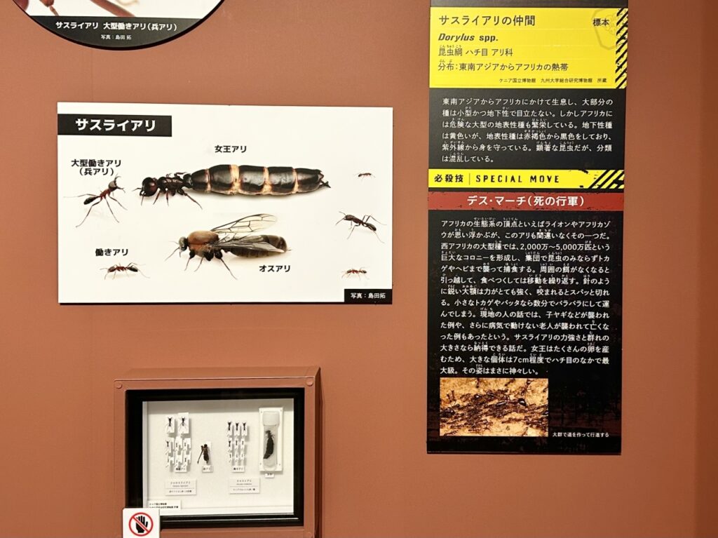 The queen ant, the center of the colony, has long been considered an elusive and almost mythical creature, difficult to even confirm despite years of research by researchers both in Japan and abroad. However, Munetoshi Maruyama, associate professor at the Kyushu University Museum and one of the exhibition’s supervisors, and Taku Shimada, an insect explorer and photographer, conducted research in the Republic of Kenya. During filming for the TBS program “Crazy Journey,” they successfully encountered and photographed a queen ant. One of these precious queen ant specimens is on display in Japan for the first time at the venue.