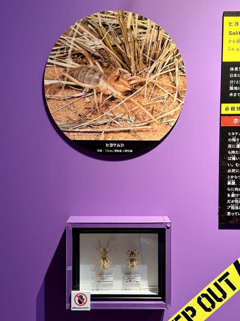 Speaking of creatures that are all show and no substance, the “highly venomous” sun spider, described as “one of the most frightening in the arthropod kingdom based on first impressions alone,” is a prime example. Its enormous chelicerae are impressive, but it poses no real threat beyond that. Although it may appear to charge towards humans, it is actually just seeking shade to escape the sun, which it dislikes, and is quite timid. It possesses neither venom nor a venomous stinger, so it’s a mystery why it was included in this exhibition, but that’s part of its charm. Its “dangerousness” based on its appearance is certainly on par with the main attraction.