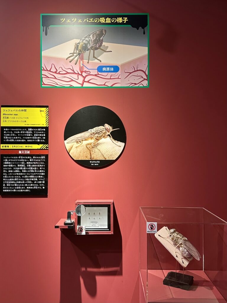 The exhibition begins with a “highly venomous” section analyzing the toxins of diverse creatures such as wasps, baby monitor lizards, and blue-ringed octopuses. This is followed by a “chemical attack” section featuring bizarre special moves such as the striped skunk’s powerful stinging liquid, 100°C high-temperature gas, and self-destructive defenses. The “electric shock” section explores the power generation mechanisms of creatures like electric eels, which can generate voltages of up to 850 volts. Finally, the “blood-sucking” section focuses on blood-sucking creatures such as vampire bats and ticks, and also touches upon the dangers of infectious diseases.