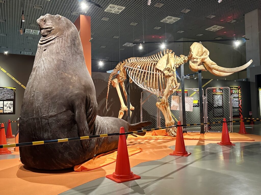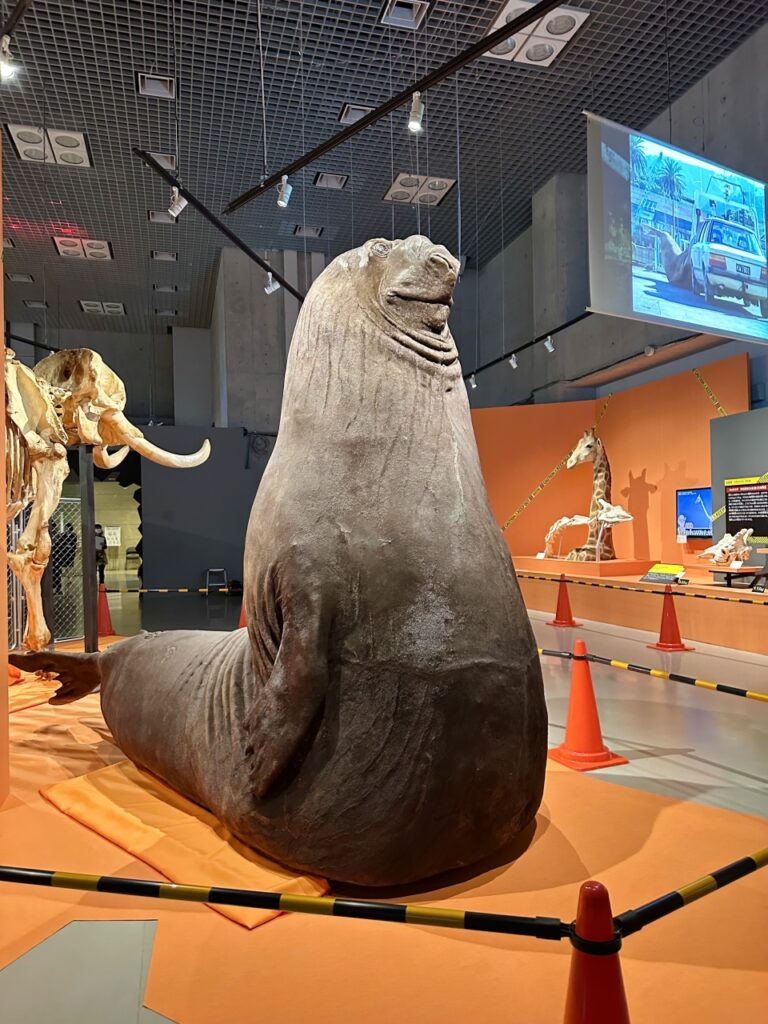 The next exhibit features a massive stuffed southern elephant seal, comparable in size to an African elephant. While many people may picture seals as laid-back, round, and calming animals, male southern elephant seals boast an impressive size of 5 meters in length and weigh 3 tons.