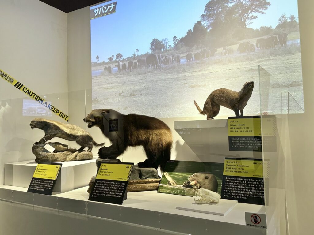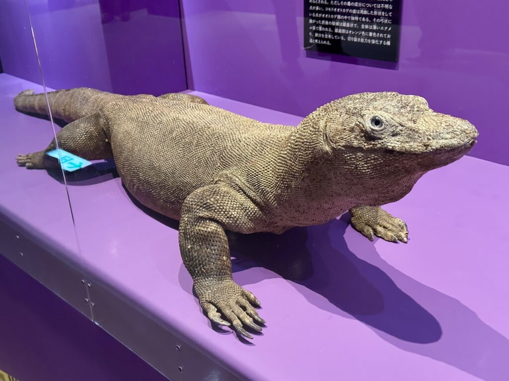 Saltwater crocodiles, sometimes called “man-eating crocodiles” due to the numerous reported fatalities, are a popular subject of interest. Among them, Lolong holds the Guinness World Record for the “largest crocodile in captivity,” with an astonishing length of 6.17m and a weight of 1,075kg. A life-size replica of Lolong, faithfully reproduced from scans of its data taken in the Philippines, is on display at the venue. Its impressive size makes the story of how it took 100 people to pull it out of the sea quite believable. Another highlight is the video explanation of the “death roll,” where the crocodile bites its prey and twists its massive body underwater to tear it apart.