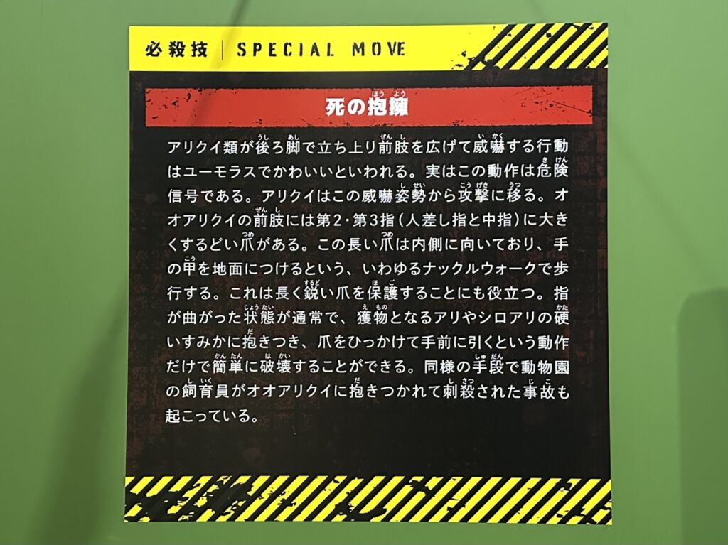 Basically, each exhibit showcases one special move for each species, and apparently, the names of each move were created specifically for this exhibition by the curators in charge of each field. From cool move names that you’ll want to say out loud, to puns, and even some that are just too straightforward, the individuality of the curators shines through.