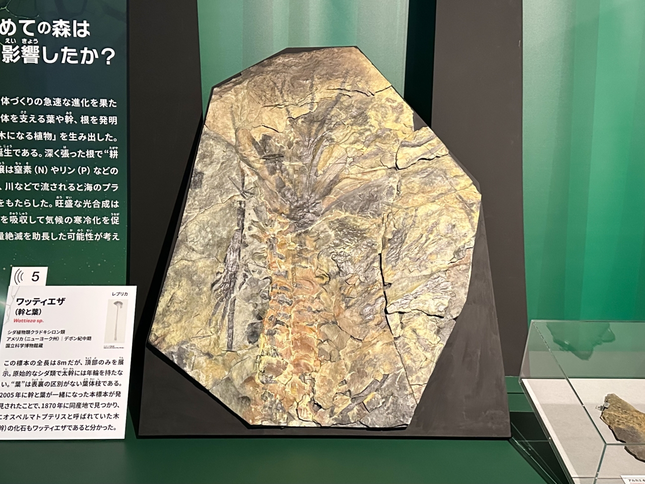 另一方面,在陆地上,没有根和叶的植物在整个泥盆纪时期经历了快速的身体结构演化。从泥盆纪中期开始,出现了几个具有粗壮树干并最终成为树木的分类群。其中,世界上已知最古老的树木是原始蕨类植物瓦氏蕨(Wattiersa),发现于美国纽约州(本次展览展出了其复制品)。早期裸子植物和小叶植物也相继出现,历史上最早的森林形成于泥盆纪晚期。