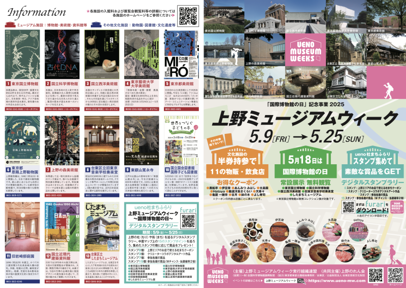 在上野地區,為紀念5月18日國際博物館日,上野公園周圍的13個設施,包括博物館、美術館和動物園,將與上野暖簾協會的會員商店合作舉辦上野博物館週。從去年開始就大獲成功的數位印章拉力賽今年也將繼續舉辦,並且還將新增全新裝修的場所“下町風俗資料館”,讓這一周變得更加精彩紛呈。結合我們每年的「城鎮樂趣」優惠券,享受這個特別的時刻,整個上野將變成一個充滿藝術的主題樂園。